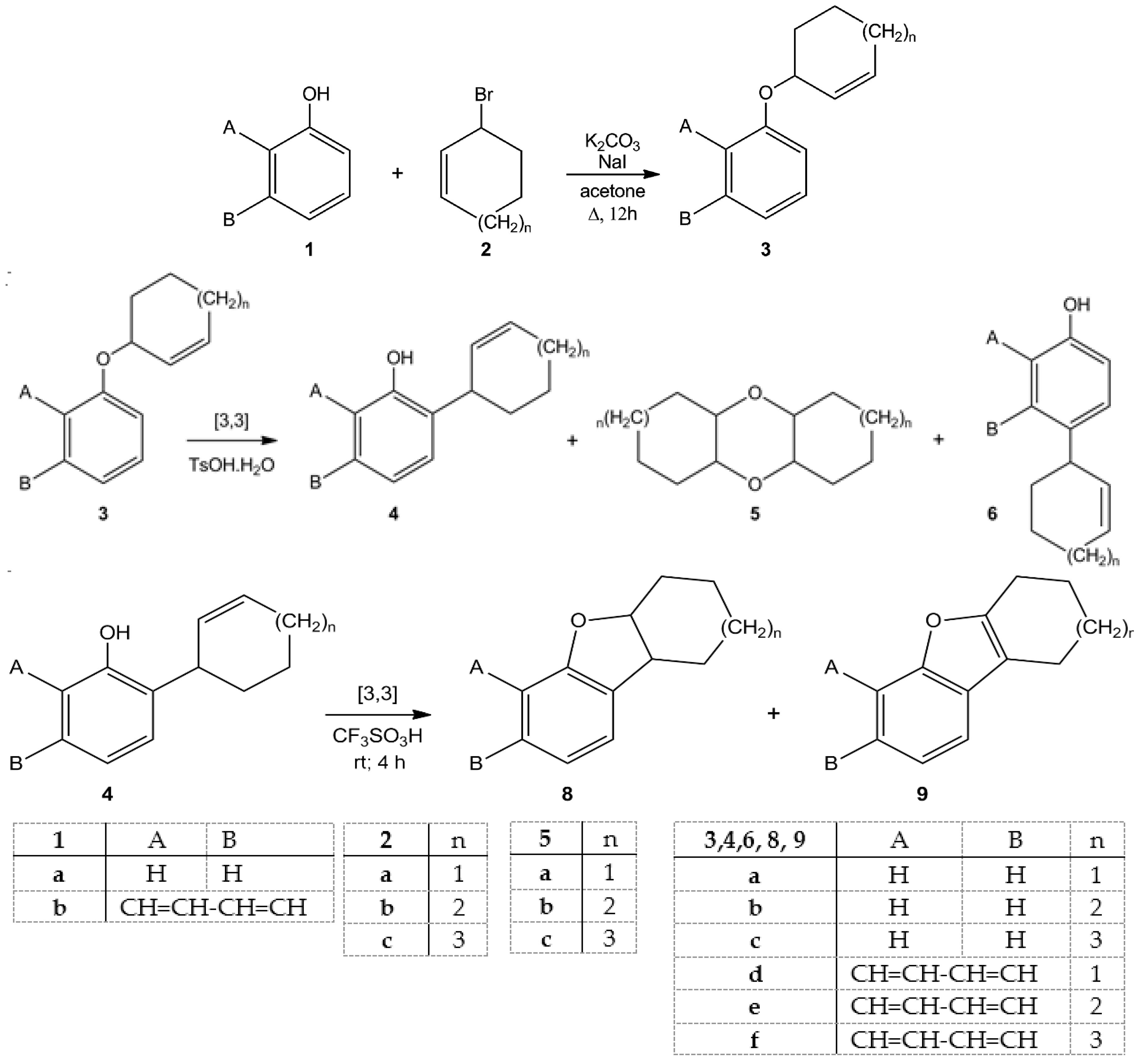 Previously we developed methods for the preparation of cycloalkano-naphthofuran derivatives by the reaction of naphthol and cycloalka-1,3-dienes [13]. In those one-pot reactions we had assumed that the process went through the initial formation of naphthyl ether followed by acid catalyzed intramolecular cyclization. However, we were unable to isolate the naphthyl ether intermediates and under the forcing conditions some part of the product underwent fast dehydrogenation. With the aim of continuing our efforts to synthesize novel heterocyclic compounds, we have now examined the synthesis and rearrangement reaction of phenyl and naphthyl ethers. We report here the results and the preparation of the new compounds.