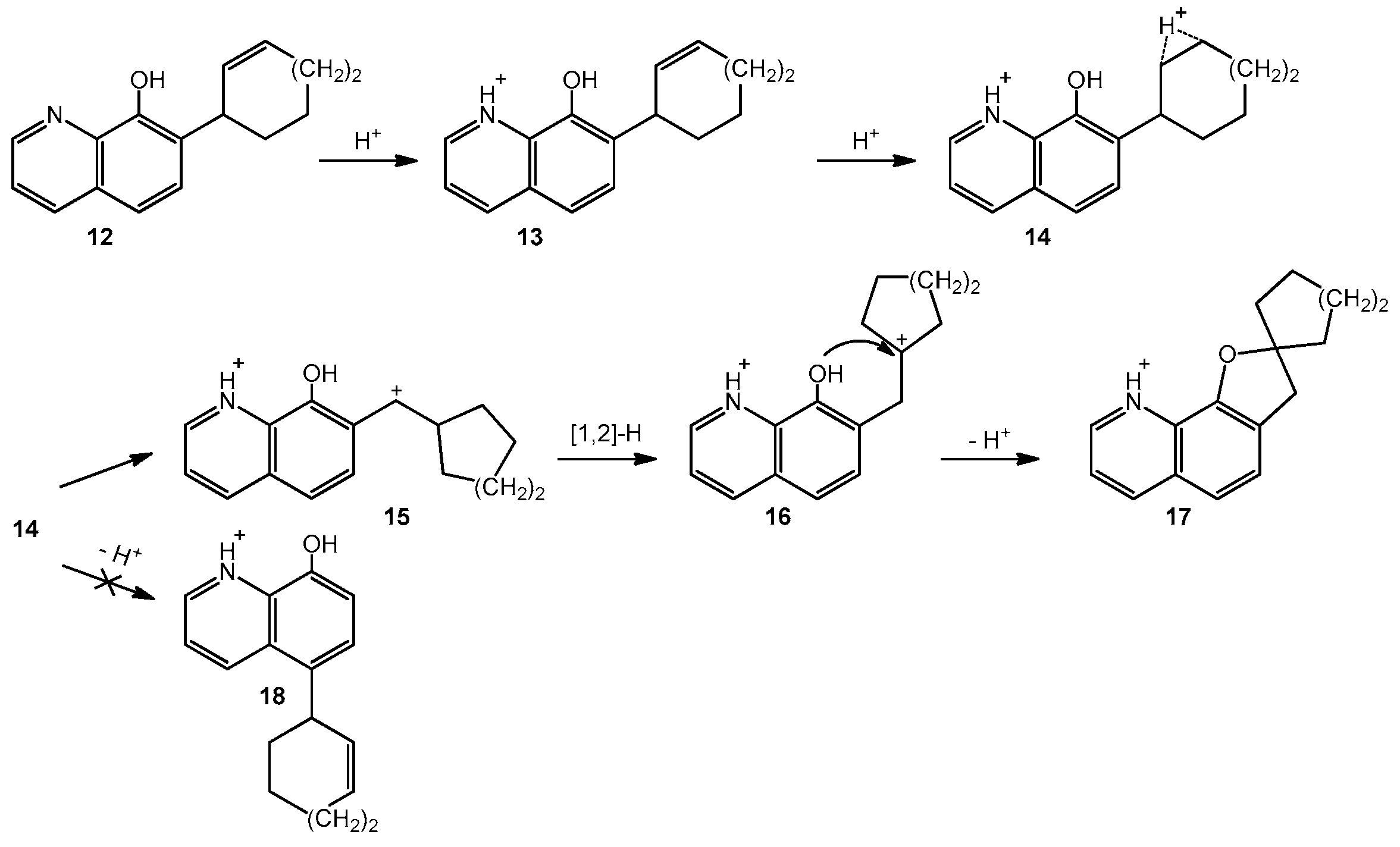 The stabilization effect of the aromatic ring in intermediate state D is crucial. We have found a compelling proof of this effect when explored a similar rearrangement paths for some analogous compounds: 7-(2-cycloalken-1-yl)-8-quinolines [27], where again 6-, 7- and 8-membered cycloalkene rings were considered. In an acidic environment the resting state of these compounds is the N-protonated form (Scheme 3). The rearrangement can then occur along two different pathways. In the first route additional protonation of the aromatic ring yields the proper doubly-protonated form for the Cope rearrangement. However, formation of the d-analogue intermediate would require the interaction of two positively charged rings, which is highly unfavorable and the system breaks apart. The second possibility is that the N-protonated form rearranges to the proper protonated form for the intramolecular Cope reaction where the 7C position of the quinoline is protonated. Due to the strong basicity of the N site, this is a much less favorable state by 29.0 kcal/mol free energy implying that this form cannot be observed in practice. The rate-determining step features a transition state at 42.0 kcal/mol on the free energy scale. These results indicate that the rearrangement of these quinolines cannot be observed under normal circumstances.