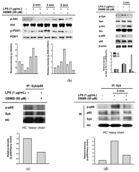 We then conducted a Syk kinase assay to confirm whether the inhibitory target of DBMB is Syk. In order to do this, we immunoprecipitated Syk from RAW264.7 cells induced by LPS for 10 min and immunoprecipiated p85/PI3K, a downstream molecule phosphorylated by Syk [28,29,30], from unstimulated RAW264.7 cells; then these Syk and p85 were mixed with 200 μM ATP. We found phosphorylation level of p85 was decreased when DBMB was treated (Figure 3c), confirming that DBMB is able to block phosphorylation capacity of Syk kinase to its substrate. We further tested the interaction of Syk and its substrate p85 by immunoprecipitation (Figure 3d). In agreement with previous data, phospho-Syk was strongly inhibited at 3 min. In agreement with our Syk kinase assay results, phospho-p85 was considerably abrogated. These results imply that DBMB has an ability to suppress Syk kinase activity.