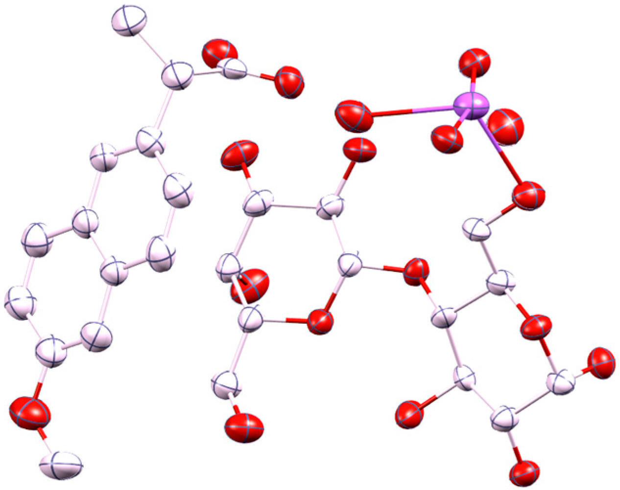 Displacement ellipsoid plot of the NaN-Lact-4H2O co-crystal showing the asymmetric unit (ellipsoids drawn at the 50% probability level); color code: Na-purple, O-red, C-light pink; H atoms are omitted.