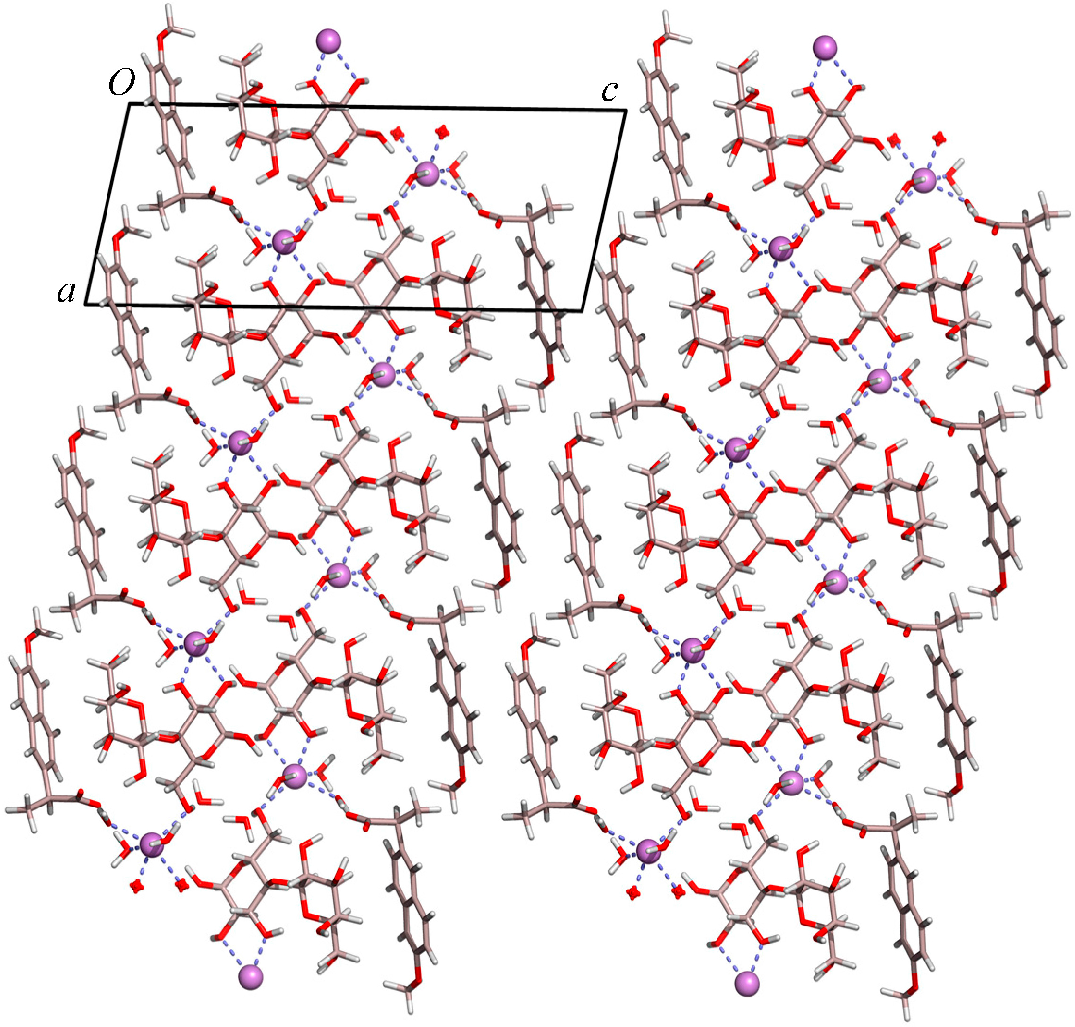 The crystal packing of NaN-Lact-4H2O, showing the water molecules included in the chains along the b axis; color code: Na-purple, O-red, C-light pink, H-white.