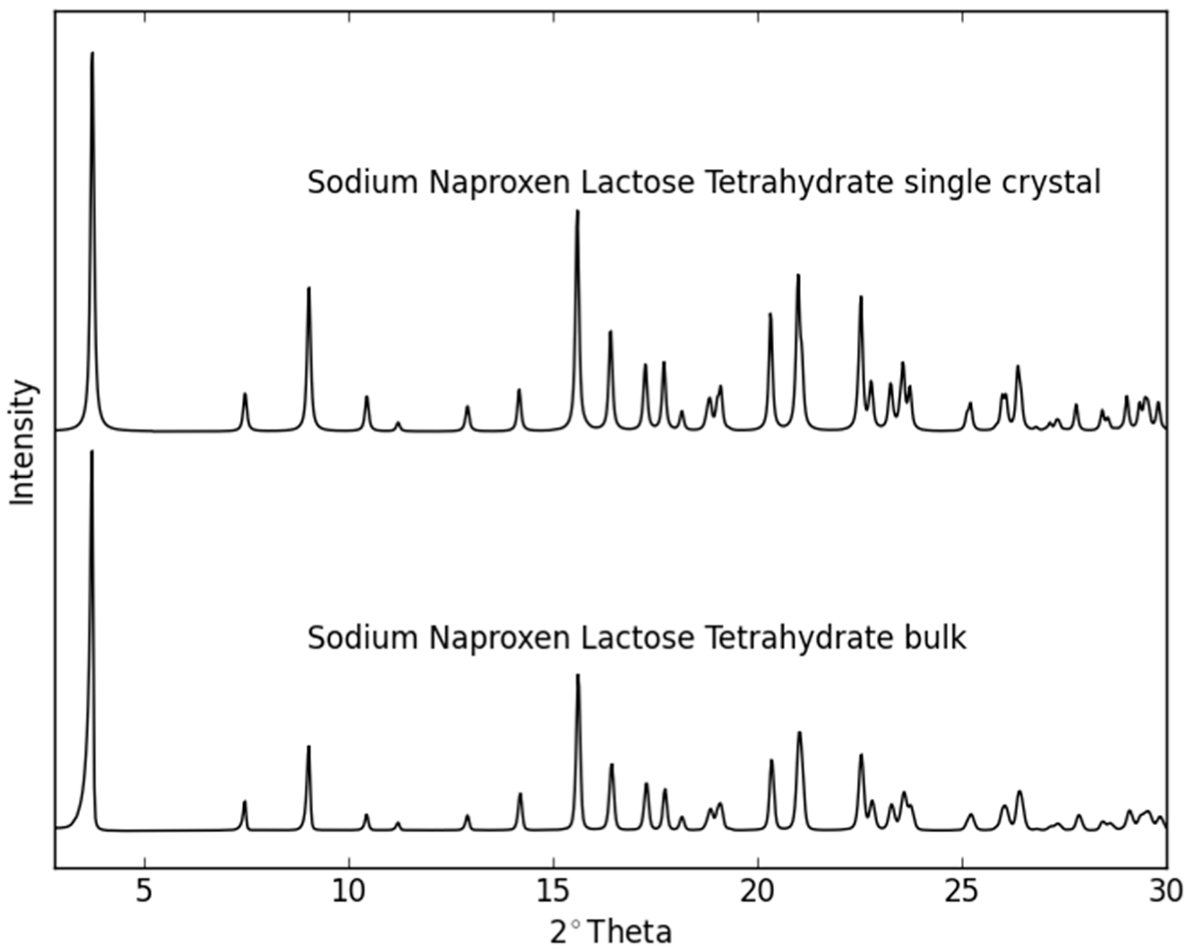 The powder diffraction pattern simulated from the NaN-Lact-4H2O co-crystal structure and the experimentally-determined XRPD diffractogram of the bulk material.
