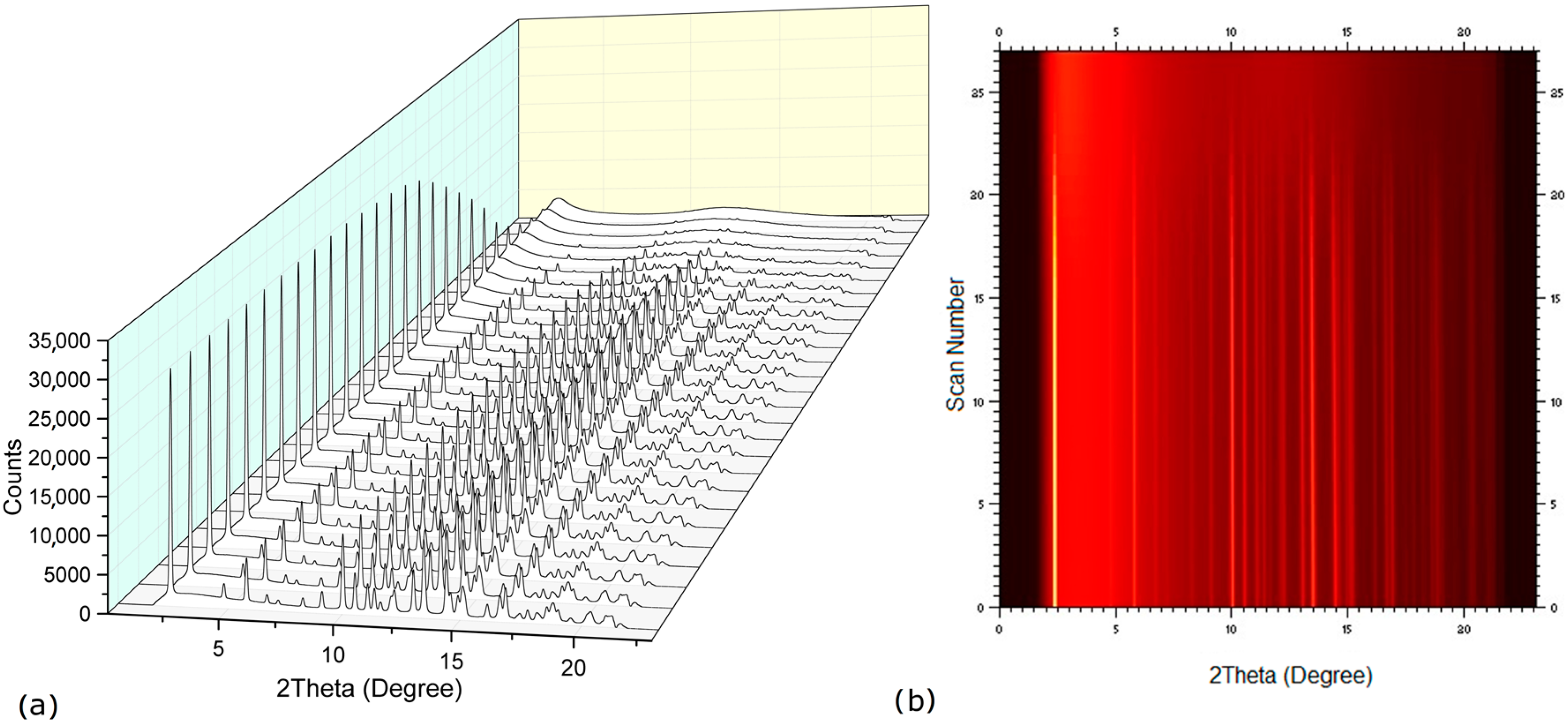 Synchrotron powder data collected upon heating from 27 to 127 °C, showing the transformation from the NaN-Lact-4H2O co-crystalline state to the NaN-Lact co-amorphous form. (a) powder patterns, (b) view of the intensities.