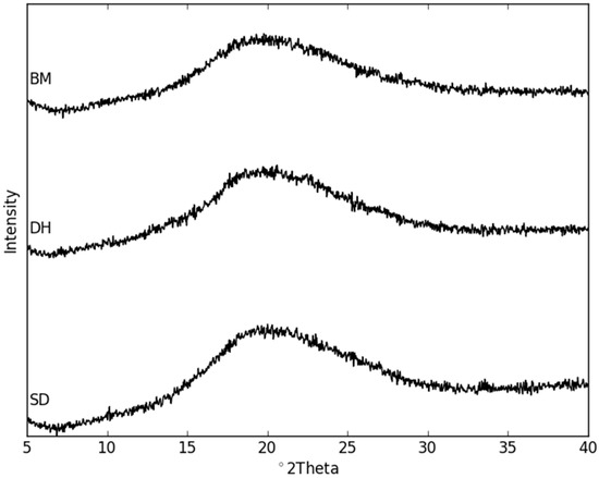 X-ray powder diffraction patterns of the freshly prepared co-amorphous BM, DH, and SD samples.