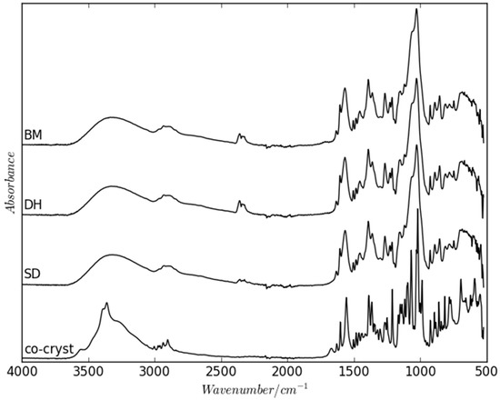 FT–IR spectra of the freshly prepared co-amorphous BM, DH and SD samples, as well as the NaN-Lact-4H2O co-crystal.