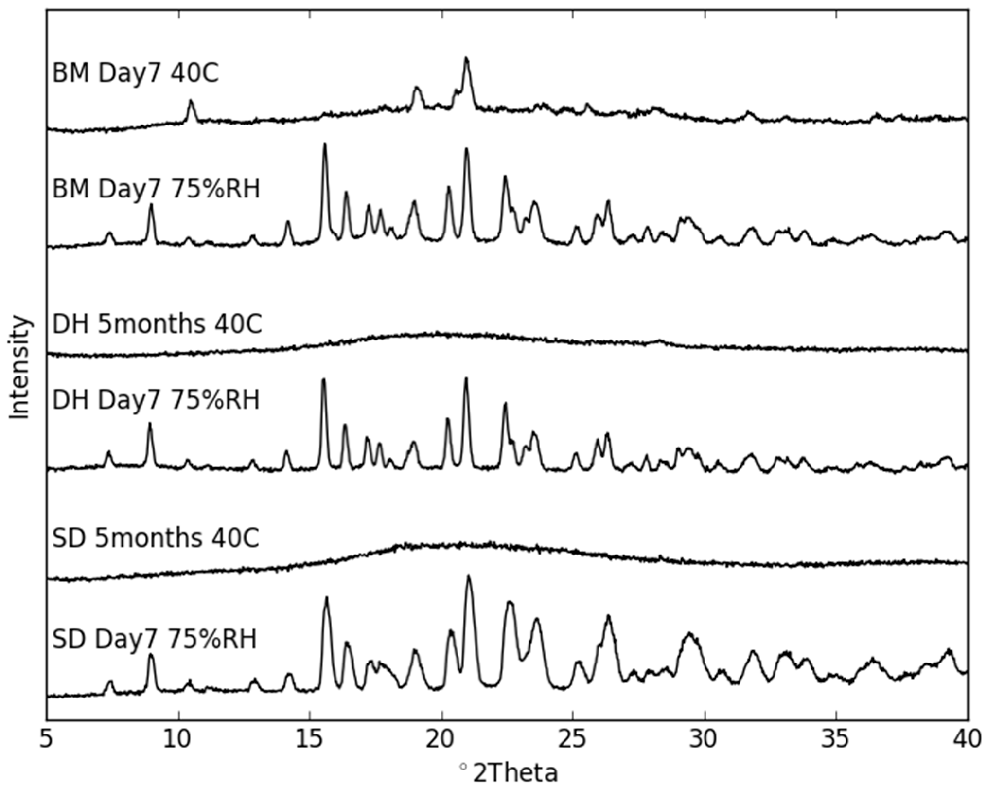 XRPD diffractograms of co-amorphous BM, DH and SD samples stored for seven days (BM) and five months (DH and SD) at 40 °C under dry conditions, as well as for seven days at 25 °C/75% RH.