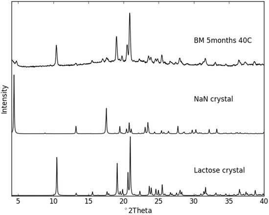 Recrystallization XRPD pattern of ball milled co-amorphous NaN-Lact after five months storage at 40 °C, showing the predominant crystalline powder pattern of Lact and a small contribution of crystalline NaN. NaN crystal and Lact crystal diffraction patterns were simulated from the known crystal structures (CSD refcodes: ASUBUL for NaN and BLACTO for Lact).