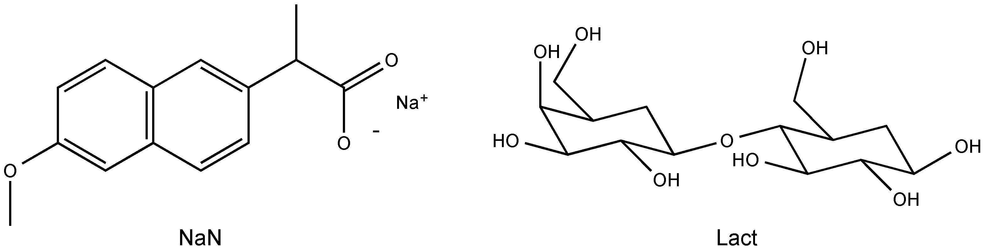 Sodium naproxen anhydrate (NaN) was received from Divi’s Laboratories Limited (Hyderabad, India). Anhydrous lactose (Lact) (Supertab® 22AN) was received from DMV-Fonterra Excipients (Goch, Germany). All materials were of analytical grade and used as received. The chemical structures of both materials are shown in Figure 9.
