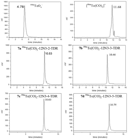 HPLC chromatograms of 99mTcO4− (tR = 4.78 min), [99mTc(CO)3]+ (tR = 11.68 min), 7a (tR = 10.53 min), 7b (tR =10.46 min), 7c (tR = 10.63 min) and 7d (tR = 10.75 min).