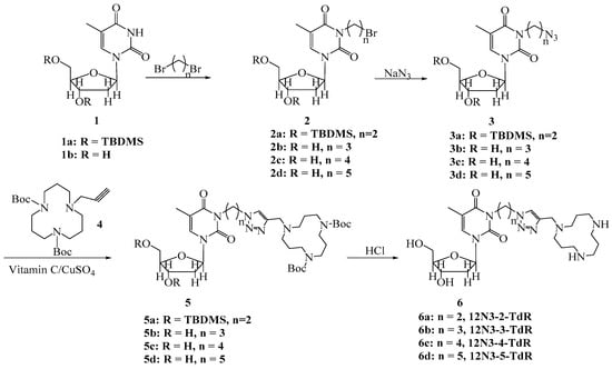 The syntheses of 12N3-2-TdR (6a), 12N3-3-TdR (6b), 12N3-4-TdR (6c) and 12N3-5-TdR (6d) are depicted in Scheme 1. Compound 1a was synthesized according to the literature []. Compound 4 was synthesized according to the literature [].