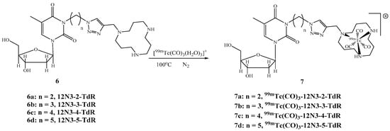 Compounds 6a, 6b, 6c and 6d were synthesized by multi-step reactions from the starting materials thymidine via “click” reaction. The reaction equations were shown in Scheme 1. They were identified by 1H-NMR, 13C-NMR, ESI-MS (Electrospray Ionization Mass Spectrometry), HRMS (High Resolution Mass Spectrometry) and the results agreed well with the expected chemical structures. The final products were suitable tridentate precursors for the [99mTc(CO)3]+ core (Scheme 2). Compounds 7a, 7b, 7c and 7d were obtained with high radiochemical purity (Figure 1).