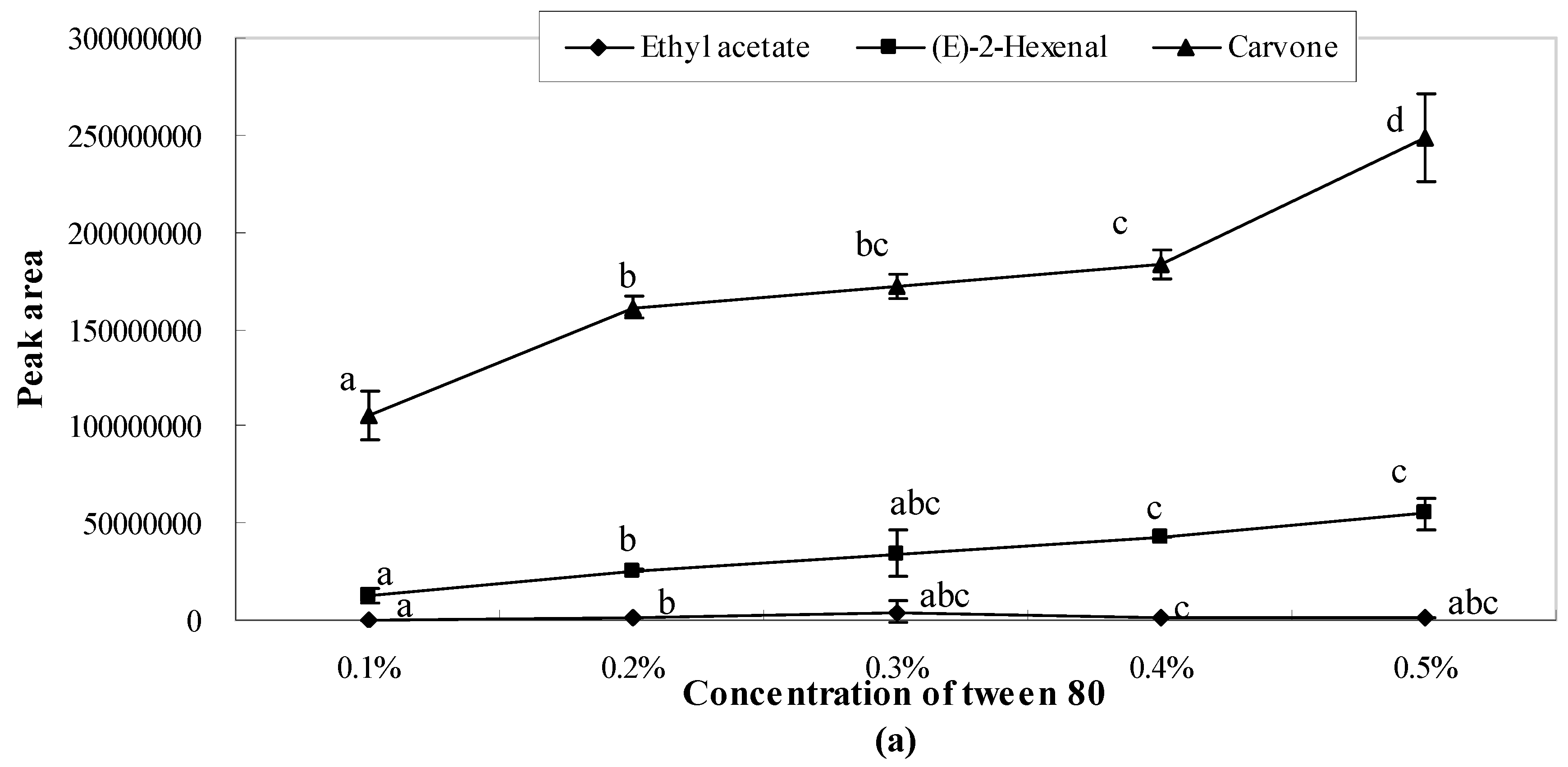 The concentration gradient (0.1%, 0.2%, 0.3%, 0.4%, and 0.5%) of Tween 80 affected the release of aroma compounds. As shown in Figure 1a, the release of (E)-2-hexenal and carvone showed significant changes for different concentrations of Tween 80 solutions. The amount of ethyl acetate was relatively small, and the peak area of the released ethyl acetate reached the highest level in 0.3% Tween 80 solution. The other three aroma compounds (3-carene, α-pinene, limonene) also showed the highest peak areas in 0.3% Tween 80 solution (Figure 1b), while all seven aroma compounds showed the lowest peak areas when the concentration of Tween 80 was 0.1%.