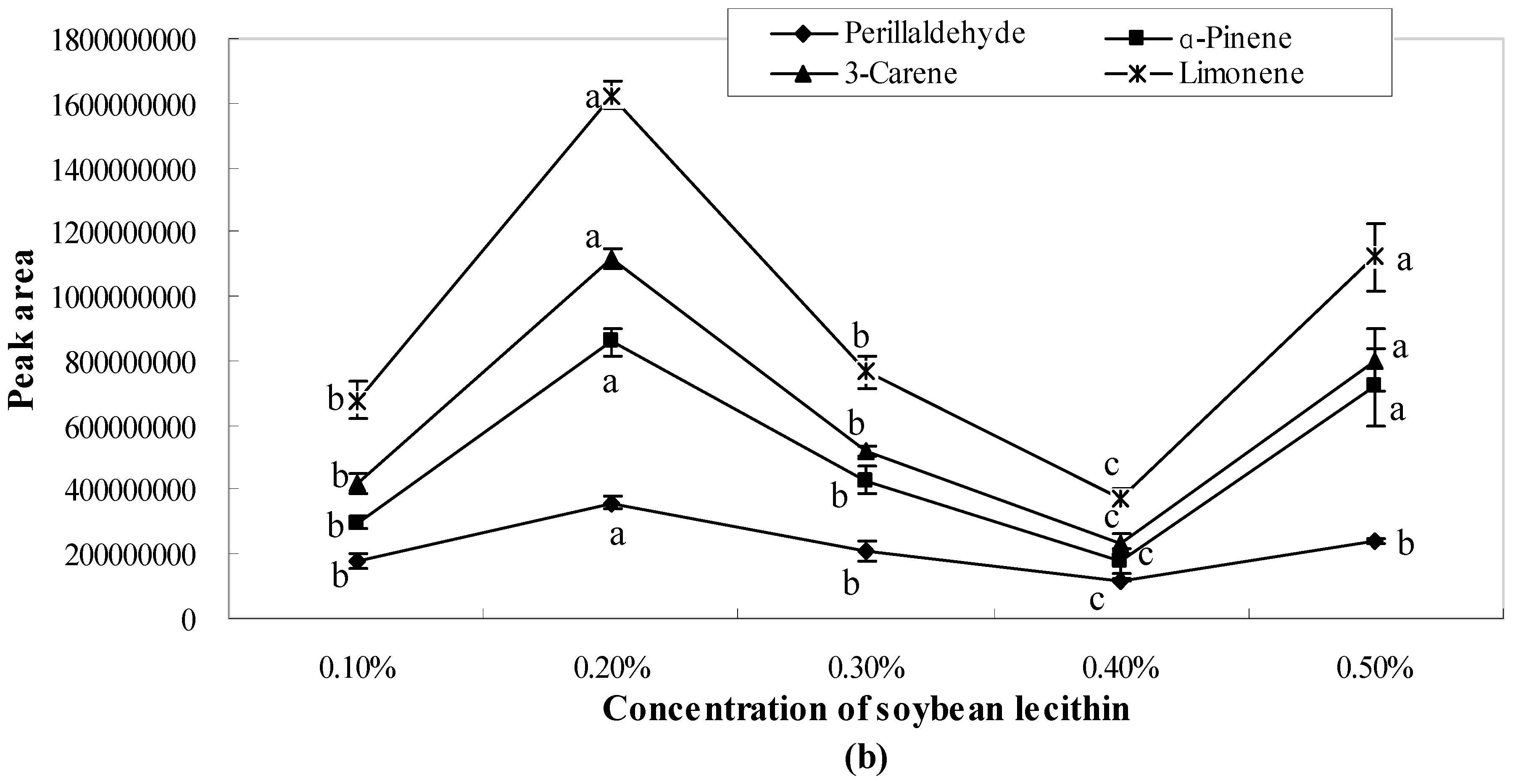 Figure 2. Effects of soybean lecithin on the release of ethyl acetate, (E)-2-hexenal, carvone (a) and perillaldehyde, α-pinene, 3-carene, limonene (b). Significant differences (p < 0.05) between different concentrations are performed by letters on the same polylines. Where the letters on the same polyline are the same, there is no significant difference between different concentrations.