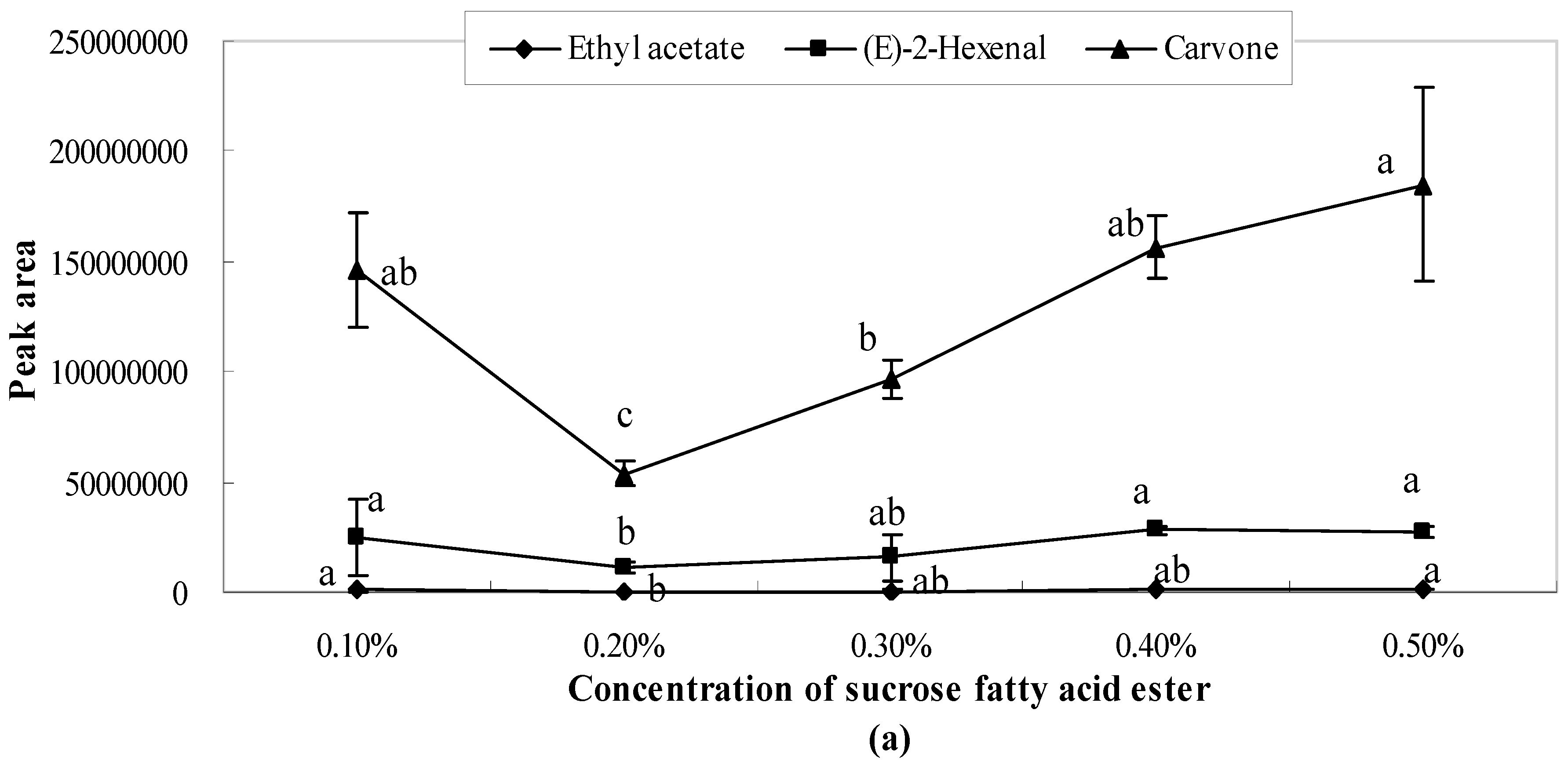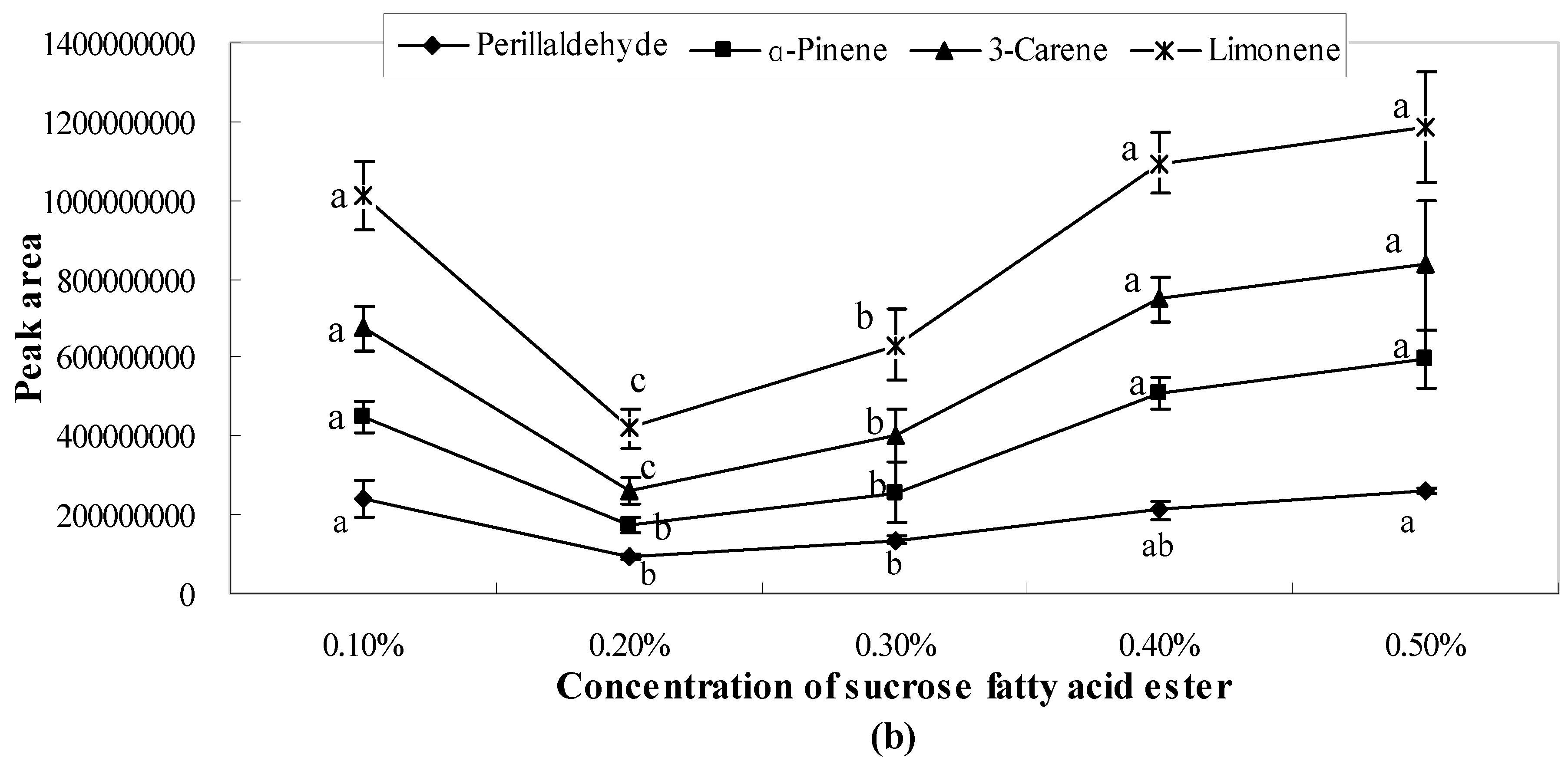 Figure 3. Effects of sucrose fatty acid ester on the release of ethyl acetate, (E)-2-hexenal, carvone (a) and perillaldehyde, α-pinene, 3-carene, limonene (b). Significant differences (p < 0.05) between different concentrations are performed by letters on the same polylines. Where the letters on the same polyline are the same, there is no significant difference between different concentrations.