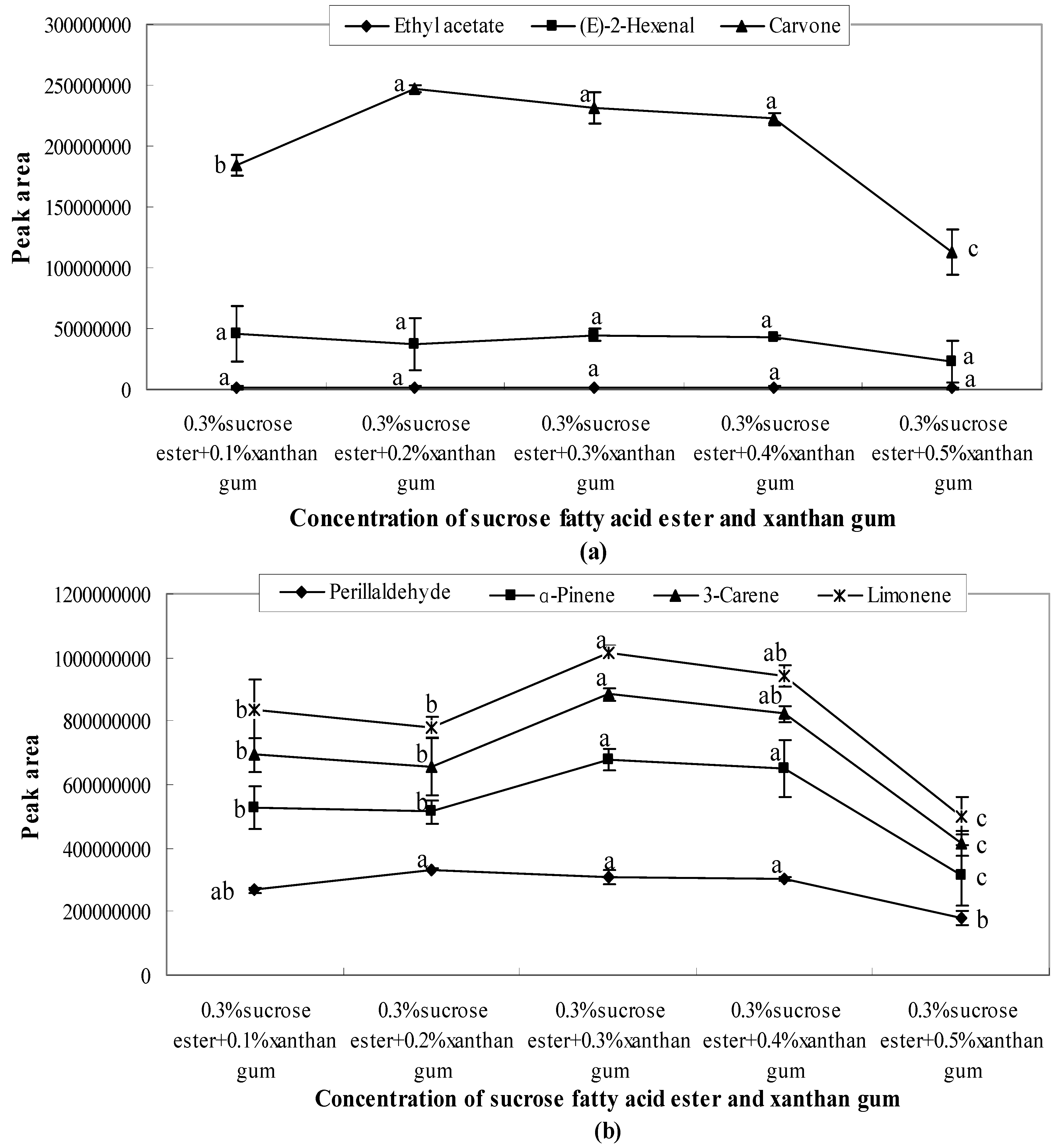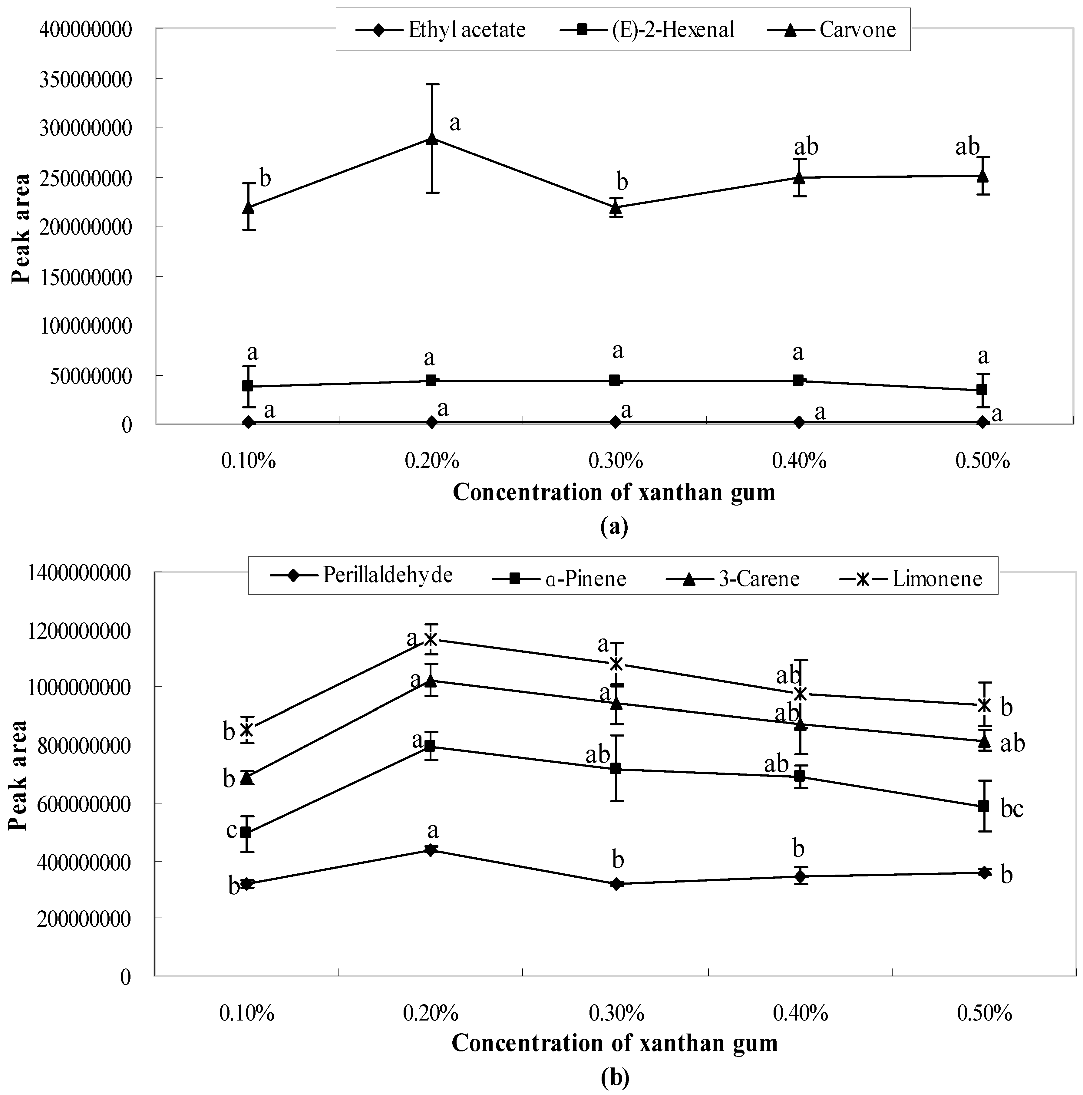 As shown in Figure 4, there were no significant differences (p > 0.05) in the peak areas of ethyl acetate and (E)-2-hexenal at different concentrations of xanthan gum solutions. This indicated that the concentration of xanthan gum had little influence on these two aroma compounds. As shown in Figure 4a, when the concentration of xanthan gum solution is 0.1% and 0.3%, the quantities of carvone and perillaldehyde released are the lowest; whereas when the concentration was 0.2%, the quantities released were the highest. However the release of ethyl acetate and (E)-2-hexenal had the lowest peak areas in 0.5% xanthan gum solution. In Figure 4b, the peak area was the lowest in 0.1% xanthan gum solution, which is approximately 0.5%. After 0.2%, the quantity of α-pinene, 3-carene, and limonene released exhibited a decreasing trend.