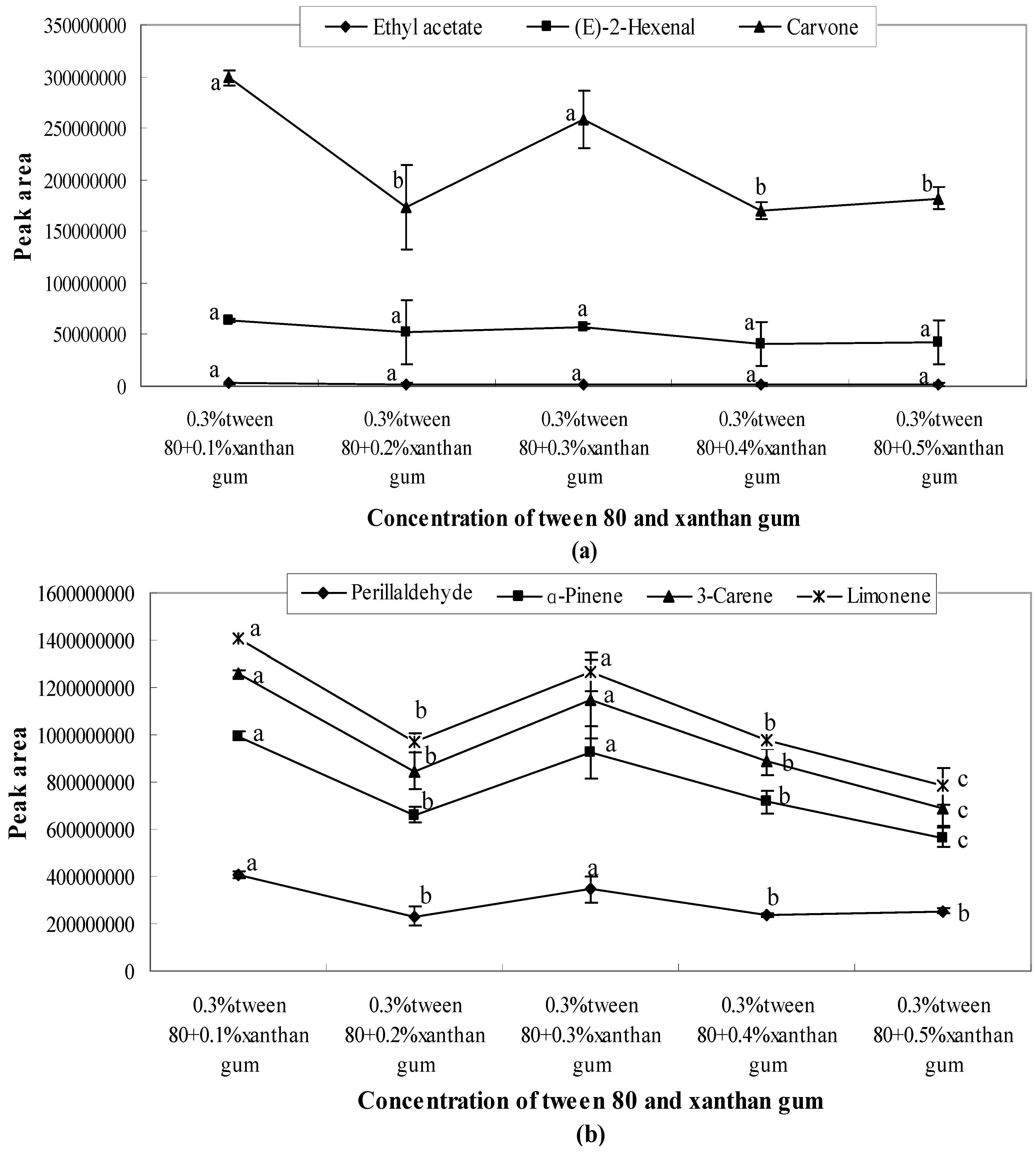 Figure 5. Effects of Tween 80 and xanthan gum on the release of ethyl acetate, (E)-2-hexenal, carvone (a) and perillaldehyde, α-pinene, 3-carene, limonene (b). Significant differences (p < 0.05) between different concentrations are performed by letters on the same polylines. Where the letters on the same polyline are the same, there is no significant difference between different concentrations.