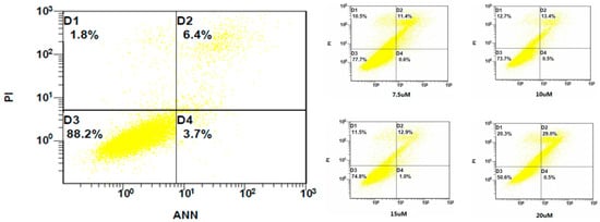 To exhibit a far more explicit function of compound 5b on HCC1937 Cells, we did a cell flow experiment with HCC1937. When the concentration of 5b was 7.5 μM, the proportion of apoptotic cells was 11.4%. When the concentration was 10 μM, the proportion of apoptotic cells was 13.4%. When the concentration was 15 μM, the proportion of apoptotic cells was 12.9%. When the concentration was 20 μM, the proportion of apoptotic cells was 29%. The proportion of apoptotic cells in control group was 6.7%. As the concentration increased, the number of apoptotic cells increased gradually and the number of apoptotic cells and concentration were directly proportional, although there was no significant difference between 10 μM and 15 μM. The results are shown in Figure 2.