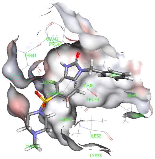 Using the Pharmacophores Ligand module of the Profiler DS3.1 program to reverse the drug group screening, a total of 1300 targets were screened. According to the reverse pharmacodynamic docking method, 5b has a good effect on CDK2. The results are shown in Table 2. In the molecular docking of compound 5b and CDK2, the oxygen atom of the sulfonic group and SER141 amino acid residues form hydrogen bond interactions, suggesting that compound 5b has a good binding capacity to CDK2 protein. The results are shown in Figure 3.