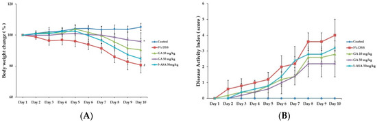 To explore the potential of GA as a useful therapeutic in UC, we examined its effects on DSS-induced UC in a mouse model. The aims were to evaluate the effect of GA on clinical signs including weight loss, colon shortening, diarrhea, and gross bleeding, and to investigate the role of GA on inflammatory mediators in DSS-treated mice.