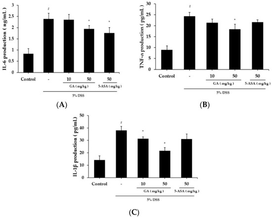 Serum IL-6 level was significantly higher in the DSS treatment group (2.394 ± 0.246 ng/mL) than in the control group (0.839 ± 0.227 ng/mL) (Figure 3A). IL-6 level was lower in the GA 50 mg/kg group (1.943 ± 0.152 ng/mL) than the DSS-treated group. The serum TNF-α level was also increased in the DSS treatment group (24.376 ± 1.76 pg/mL) compared to the control group (8.943 ± 1.847 pg/mL), but was significantly inhibited in the GA 50 mg/kg group (18.441 ± 2.246 pg/mL) (Figure 3B). The serum IL-1β level was increased in the DSS treatment group (38.105 ± 3.152 pg/mL) compared to the control group (14.318 ± 3.206 pg/mL) (Figure 3C). IL-1β levels were lower in GA treatment groups (GA 10 mg/kg; 31.416 ± 1.406 pg/mL, GA 50 mg/kg; 21.721 ± 2.548 pg/mL).