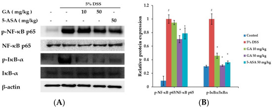 Effects of GA on transcription factors in DSS-induced UC. (A) Phosphorylation of IκBα and phosphorylation of NF-κB were assayed by Western blot; (B) Relative ratio of phospho-IκBα and NF-κB p65 calculated using an image analyzer. Values represent mean ± S.E.M. (n = 6). Data were analyzed by Student’s t-test (# p < 0.05 vs. control and * p < 0.05 vs. DSS alone).
