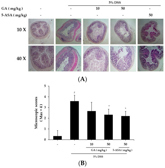 Effects of GA on epithelial injury in DSS-induced UC. (A) Paraffin sections of colonic tissue were stained with hematoxylin & eosin, and then observed by microscope (10× and 40×); (B) Microscopic scores. Values represent mean ± S.E.M. (n = 6). Data were analyzed by Student’s t-test (# p < 0.05 vs. control and * p < 0.05 vs. DSS alone).