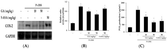 The effects of GA on COX-2 expression in colon tissues were demonstrated using western blot analysis (Figure 6A). DSS markedly induced COX-2 expression in colon tissue vs. control group, but increased COX-2 expression was significantly reduced by GA administration. Relative expression levels of COX-2 are presented in Figure 6B. COX-2 catalyzed PGE2 biosynthesis, and we examined whether GA affects PGE2 levels (Figure 6C). PGE2 levels were enhanced by DSS, and this increase was significantly inhibited by GA administration.