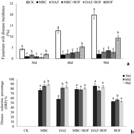 3.1. The Effects of the Soil Treatments on Fusarium Wilt Incidence
