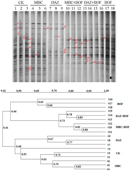 - Duineveld, B.M.; Kowalchuk, G.A.; Keijzer, A.; van Elsas, J.D.; van Veen, J.A. Analysis of bacterial communities in the rhizosphere of chrysanthemum via denaturing gradient gel electrophoresis of PCR-Amplified 16S rRNA as well as DNA fragments coding for 16S rRNA. Appl. Environ. Microbiol. 2001, 67, 172–178. [Google Scholar] [CrossRef] [PubMed]