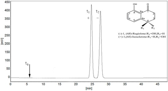 Alcohol in the mobile phase competes for chiral bonding sites with chiral solutes and can alter the steric environment of the chiral cavities on the CSP by binding to achiral sites at or near the chiral cavity []. There have been many studies to change the polarity of the mobile phase with various alcohols, such as n-butanol, iso-butanol, n-propanol, iso-propanol, and ethanol [,,]. Considering 4,8-DHT is a weak acidic material [], a certain amount of acetic acid (AA) is added into mobile phase, which can reduce the tailed of chromatographic peaks and increase the symmetry of peaks. Thus, in this study, the optimized chromatographic condition was determined to be n-hexane/iso-propanol (95:5, v/v) as the mobile phase containing 0.1% AA with a flow rate of 0.8 mL·min−1 at 20 °C and UV detection at 254 nm. The capacity factor of regiolone and isosclerone (k1 and k2), the separation factor (α), and the resolution (Rs) were calculated as follow: k1 = 4.09, k2 = 4.77, α = 1.16, Rs = 1.70. The elution order of 4,8-DHT enantiomers was distinguished at 254 nm of optical rotation detection. The first eluted enantiomer was S-(+)-isosclerone at 24.4 min and the second was R-(−)-regiolone at 27.7 min (Figure 1). Additionally, a 20.8 mg 4,8-DHT sample was separated through preparative HPLC, and the elution of enantiomers were collected. The contents of S-(+)-isosclerone and R-(−)-regiolone were 10.2 mg (yield 49.0%) and 10.0 mg (48.2%).
