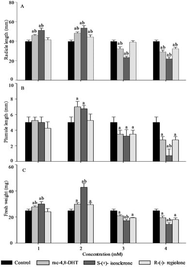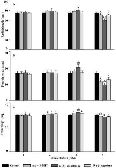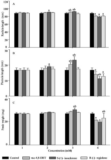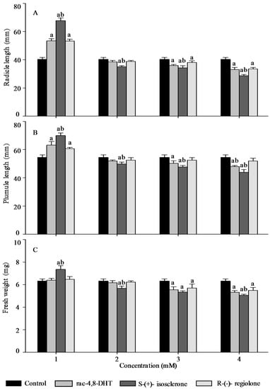 Effect of rac-4,8-DHT, S-(+)-isosclerone, and R-(−)-regiolone at different concentrations on radicle length (A); plumule length (B); and fresh weight (C) in wheat. a denotes a significant difference between control and treatments (p < 0.05); b denotes a significant difference among rac-4,8-DHT, S-(+)-isosclerone and R-(−)-regiolone (p < 0.05).