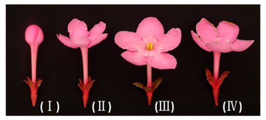 Fifteen fresh early flowering inflorescences from three L. pinceana plants (separation between plants more than 100 m, five inflorescences per plant) were collected from the Nujiang Lisu Autonomous Prefecture, Yunnan Province (25°58′N; 98°48′E) during their flourishing florescence on 10 November 2014, and inserted into deionized water before transported to the Research Institute of Resources Insects, Chinese Academy of Forestry (RIRICAF) in Kunming. Subsequently, the inflorescences were preserved at room temperature (25 ± 1 °C). The flowers were classified into four groups [23] according to their botanical characteristics (Figure 1): (I) bud stage: buds complete closed, two or three days before full bloom; (II) initial-flowering stage: semi-open petal, one day before full bloom; (III) full-flowering stage: completely open petals, observable pistils and stamens; and (IV) end-flowering stage: petals and calyxes withered, five or six day after full bloom.