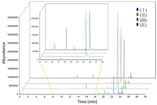 Total ionic chromatogram of volatile components emitted from flowers of L. pinceana in different stages. (I) bud stage; (II) initial-flowering stage; (III) full-flowering stage; and (IV) end-flowering stage.