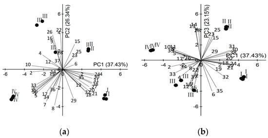 Principal component plot (PC1 vs. PC2 plots (a) and PC1 vs. PC3 plots (b)) for L. pinceana at different stages of growth, showing correlations with volatiles (numbers correspond to those in Table 1). (I) bud stage; (II) initial-flowering stage; (III) full-flowering stage; and (IV) end-flowering stage.
