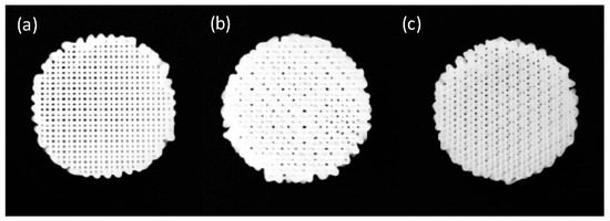 Scaffolds were designed with a 19 mm diameter and a round shape to allow their use in regular cell culture plate dishes of 12 wells. Different design parameters were studied and analyzed, such as filament diameter, distance between filaments, and deposition angle (Table 1). The final designs had 2.4 mm of thickness, composed of eight different layers of polymeric material, each 0.3 mm thick.