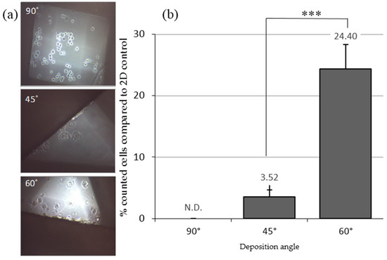 Cells cultured in 3D conditions with adherent well plates. (a) Inverted optical microscopy images of MCF7 cells seeded on different scaffold designs; (b) cells counted (%) three days after seeding in different deposition angle designed scaffolds. Results are shown as mean ± standard error. *** (p < 0.001) indicates levels of statistically significance.