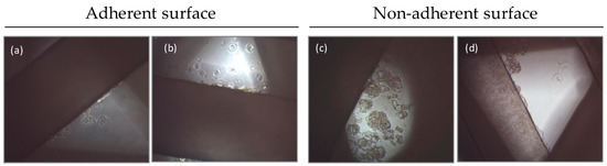 To study the effects of the well plate’s surface conditions (adherent versus non-adherent) on cell seeding efficiency and the subsequent enrichment of cancer stem cells in 3D PCL scaffolds, 12 multi-well surface plates were tested. The adherent surface conditions were tested in standard 12-well culture microplates. Non-adherent conditions were assayed with 12-well cell culture microplates treated with a hydrophobic and neutral charge polymer, poly(2-hydroxiethyl methacrilate) (pHEMA; Sigma Aldrich Co. LLC., St. Louis, MO, USA) (Figure 9). Non-adherent microplates covered with pHEMA were dried at 45 °C overnight and exposed to UV light for 20 min. The PCL scaffolds were divided in two groups and placed into the individual wells of adherent and non-adherent plates.