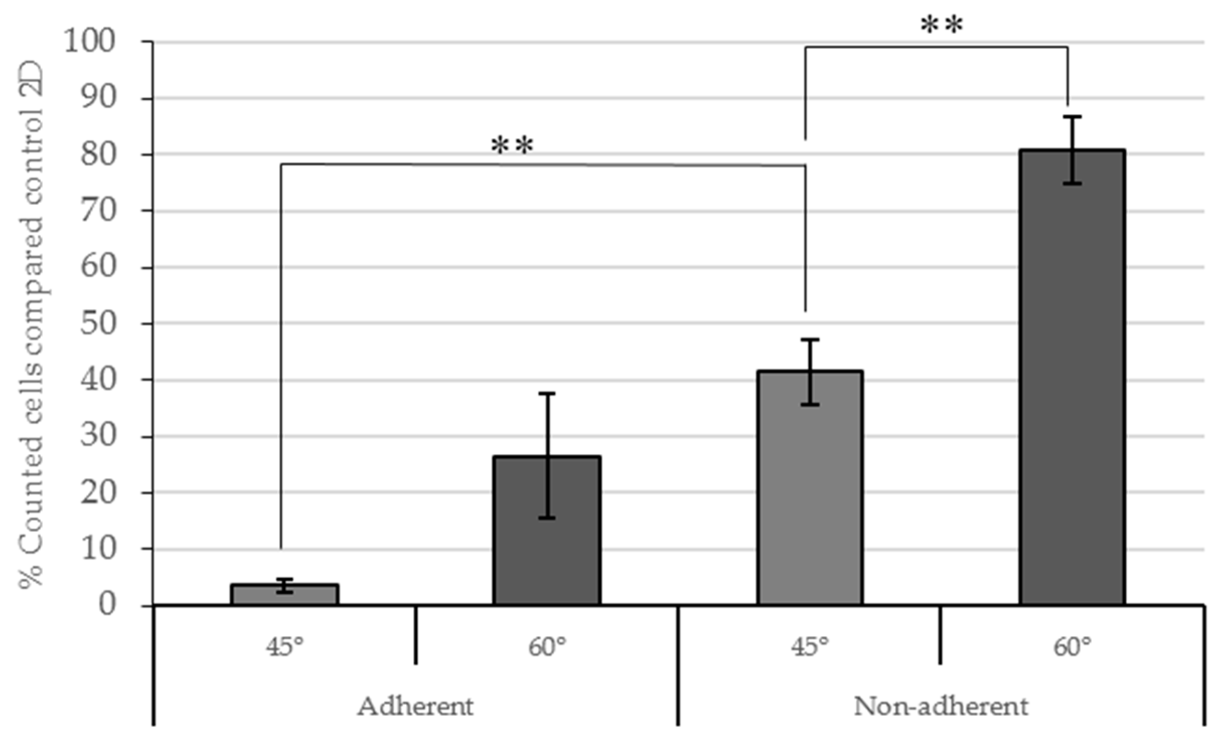 Counted cells (%) in 3D conditions compared to 2D control conditions three days after seeding. Adherent and non-adherent wells were assayed. Results are shown as mean ± standard error. ** (p < 0.01) indicates levels of statistically significance.