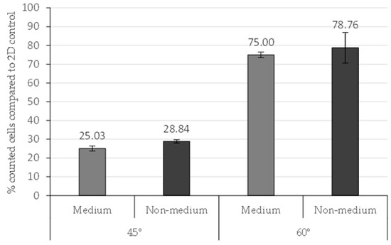 Counted cells in 45° and 60° scaffolds with previous medium or non-medium addition in the scaffold structure. Results are shown as mean ± standard error.