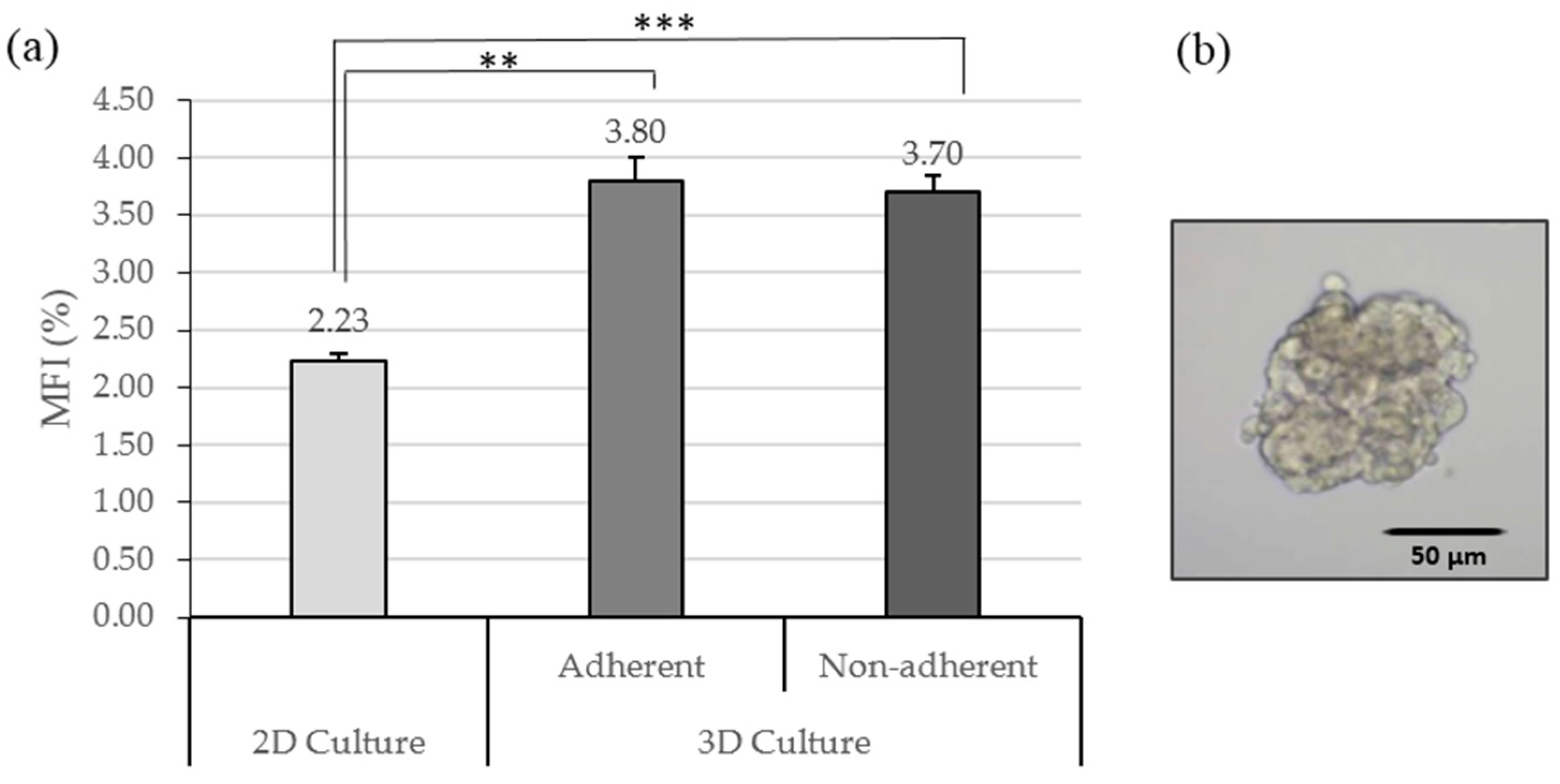 CSCs population analysis. (a) Mammospheres Forming Index (MFI; %) of 2D culture and all 3D conditions. Results are shown as mean ± standard error. (b) Inverted optical microscopy images of a MCF7 mammosphere. ** (p < 0.01) and *** (p < 0.001) indicate levels of statistically significance.