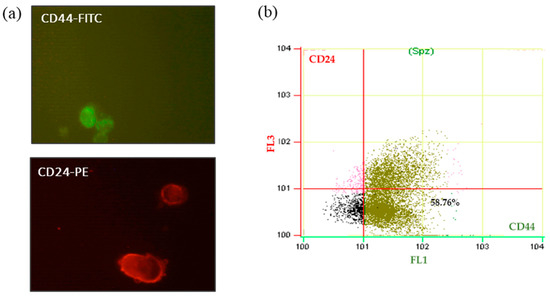 To analyze the efficiency of antibodies against MCF7 cells, fluorochromes conjugated with the antibodies were tested. Cells were observed with a confocal microscope (Figure 7a). Positive cells for CD44 were green due to the emission spectrum peak wavelength of FITC (519 nm). CD24 positive cells, conjugated with PE, were red with an emission peak wavelength of 573 nm. In this preliminary analysis of MCF7, the purity of the CD44+/CD24−/low cell population in 2D culture was 58.76% (Figure 7b).