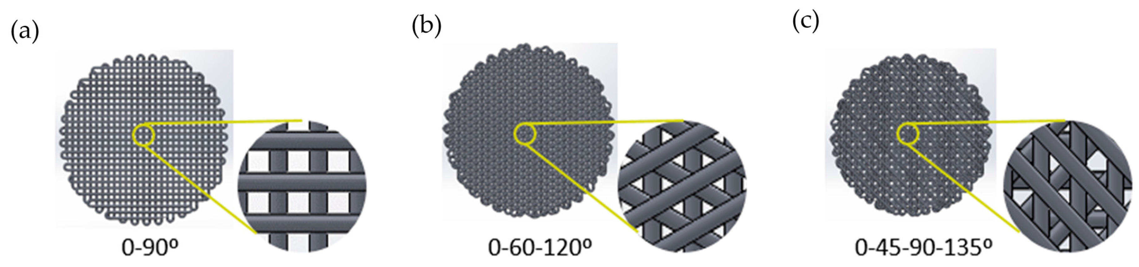 Scaffolds designs with different deposition angles: (a) 90°; (b) 60°; (c) 45°.