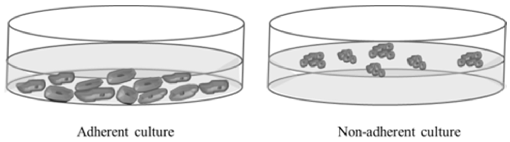 4.2. Adherent and Non-Adherent Cultures