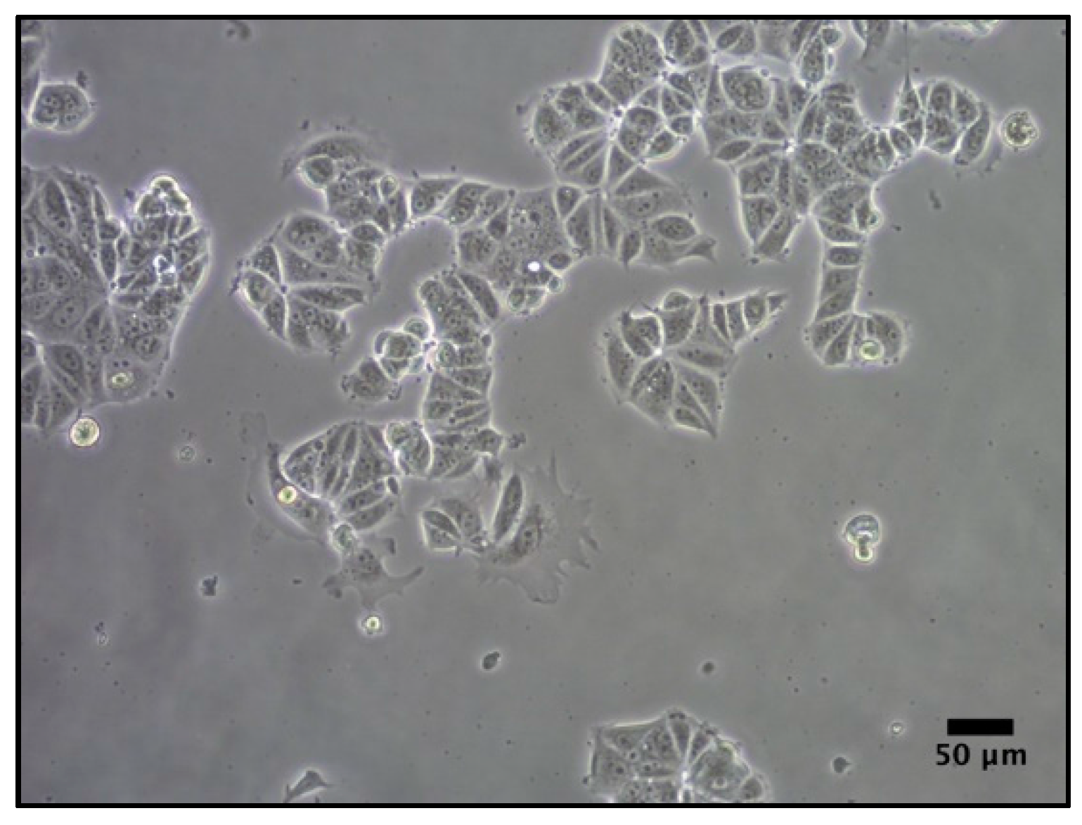 MCF-7 breast carcinoma cells (Figure 10) were obtained from the American Type Culture Collection (ATCC, Rockville, MD, USA). MCF-7, is a HER2-positive cell line—a type of breast cancer that overexpresses Human Epidermal Growth Factor Receptor 2. Previous studies evaluated the biocompatibility of the scaffold with an MCF7 cell line [15,23].