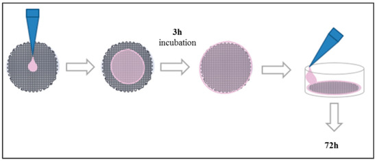 Scaffolds were placed into a 12-well cell culture microplate. First, 250 µL of cell suspension containing 100,000 cells were placed in the middle of its surface to allow cells to attach to the scaffold. After a 3 h incubation period, 1.5 mL of fresh medium were added to cover the scaffold (Figure 11). Cells were incubated for 72 h and then counted.