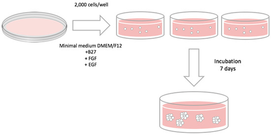 In order to evaluate CSC population, the mammosphere-forming technique was performed (Figure 12) as previously described [8]. Cells from 2D culture or 3D scaffolds were removed and re-suspended with DMEM/F12 medium supplemented with B27, EGF, and FGF (20 ng/mL), 1% l-glutamine, 1% sodium pyruvate, 25 U/mL penicillin, and 25 μM/mL streptomycin. Re-suspended cells were seeded into a six-well Cell Culture Microplate (Corning Life Sciences, New York, NY, USA) coated with pHEMA (Sigma Aldrich Co. LLC.) at a density of 2000 cells/well. Finally, cells were incubated for seven days and mammospheres bigger than 50 µm were counted using an inverted optical microscopy. The Mammosphere Forming Index (MFI) was calculated using the formula described below: