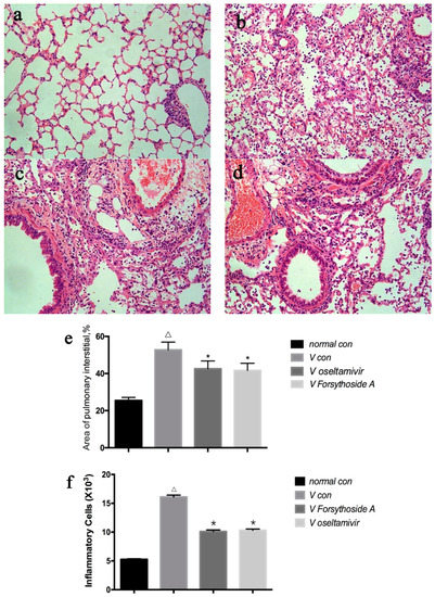 Effects of forsythoside A on the histological characterization in mice. (a–d) Representative hematoxylin and eosin staining histological sections of all the groups at day 6 ((a) normal con; (b) V con; (c) V Forsythoside A; (d) V oseltamivir group); (e,f) Changes in inflammatory cell counts and degree of edema in pulmonary interstitial. All images obtained at ×200 magnification. Δ p < 0.01 compared with normal con. * p < 0.01 compared with V con.