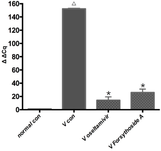 Effect of forsythoside A and oseltamivir on changing the relative expression levels of the IAV replication. Total RNA was isolated from the lung tissue. Statistics determined by two-part t test. Δ p < 0.01 compared with normal con. * p < 0.01 compared with V con.