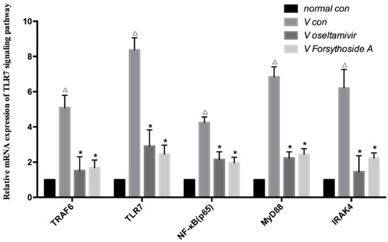 Both oseltamivir and FTA treatment reduced mRNA expression in the TLR7 signaling pathway. Compared with the V con group, the mRNA in the TLR7 signaling pathway was down-regulated in the V Oseltamivir and V FTA groups (p < 0.01). Compared with the V Oseltamivir group, the difference of the V FTA one had no statistical significance (p > 0.01) (Figure 5).
