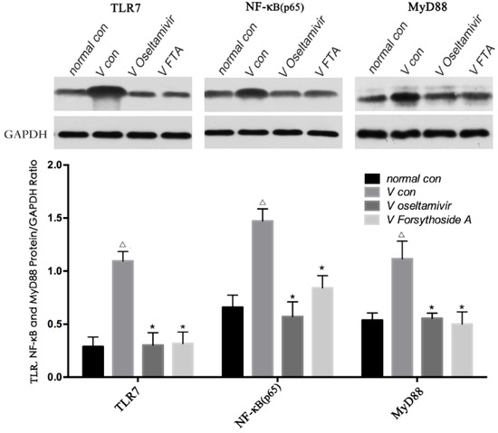 Relative protein expression of TLR7, NF-κB p65 and MyD88. Compared with the normal con, TLR7, MyD88 and NF-κB p65 protein expression was gradually enhanced in V con. Compared with the V con, the relative protein expression of TLR7, MyD88 and NF-κB p65 was down-regulated in V Oseltamivir and V FTA. Δ p < 0.01 compared with normal con. * p < 0.01 compared with V con.
